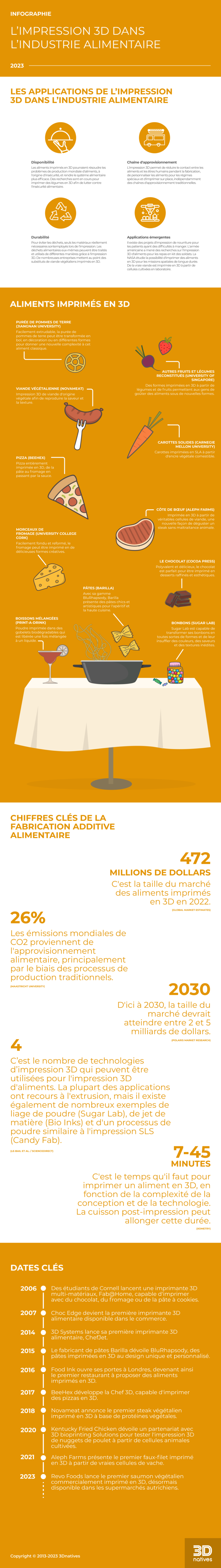 Pour faire le point sur l'usage de cette technologie, 3D Natives propose une infographie sur l'état de l'art de l'impression 3D dans l'industrie alimentaire en 2023.