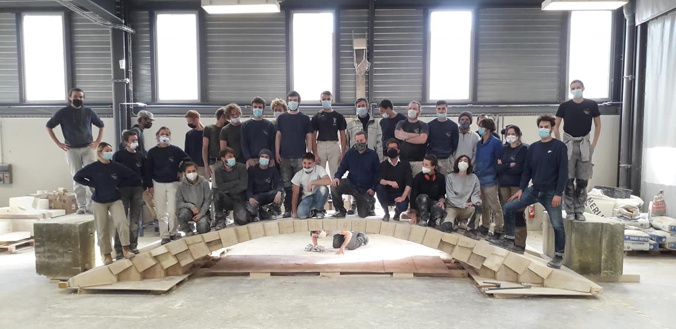 4 m de portée, 0.6 m de flèche, 15 cm d' épaisseur à la clef, 2.5 m3 de St-Leu offerts par le Fonds de dotation Verrecchia , plus de 120 éléments taillés, 5 jours , 20 apprentis en CAP 1an TDP, 20 étudiants Master 1 Architecture, 6 enseignants architectes et ingénieurs, 2 maitres de stages Compagnons, 1 intelligence collective!